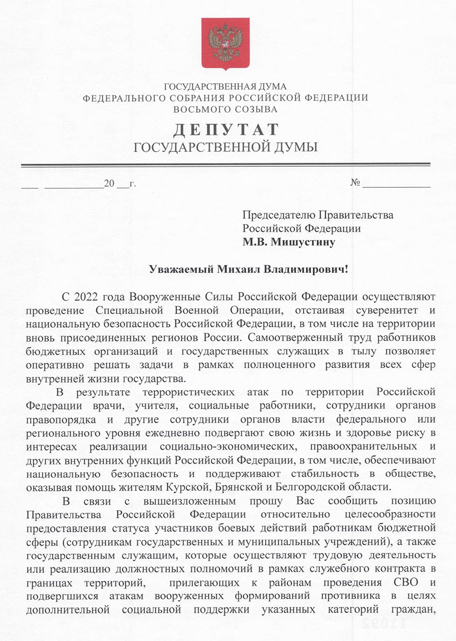 Кроме того, необходимо восстановить справедливость. Ведь сегодня статус участника боевых действий могут получить бюджетники, которых направляют в прифронтовые районы из других регионов по служебному поручению. Но почему же их местные коллеги лишены такой возможности?