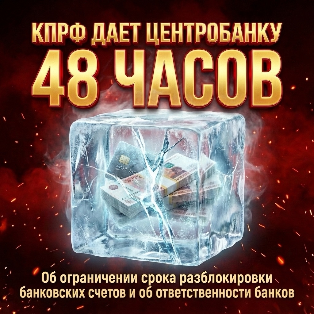 В связи с этим в рамках предстоящего отчета Центробанка РФ перед Государственной Думой фракция КПРФ намерена поставить вопрос об ограничении срока разблокировки банковских счетов - он не должен превышать 48 часов. При этом банки обязаны нести ответственность за нарушение установленных сроков, поскольку их промедление напрямую ведет к убыткам бизнеса и росту социальной напряженности.Подробнее в ВК